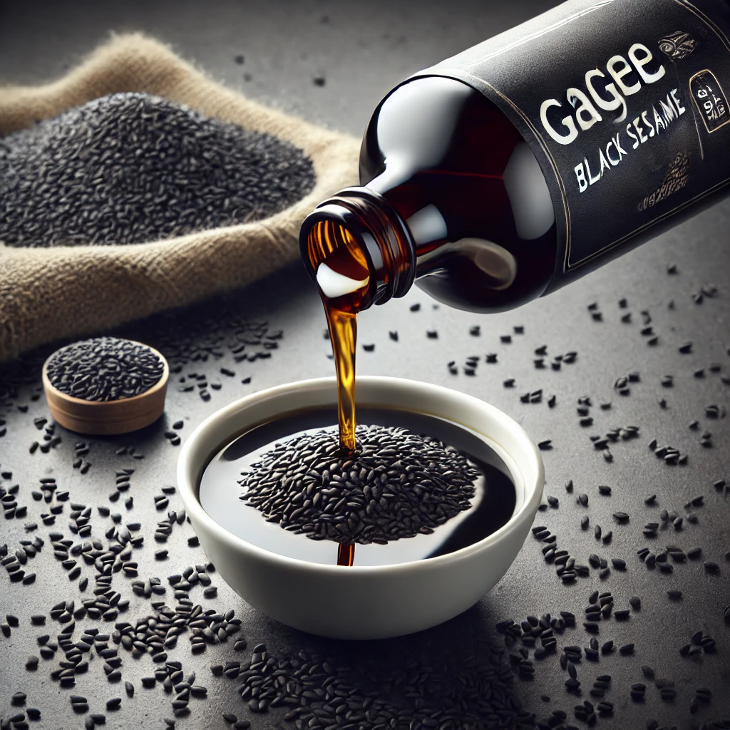 The exclusive Wood Cold-pressed Pure Black Sesame Oil from GAGEE is made from premium black sesame seeds and is packaged without the use of additives or preservatives.